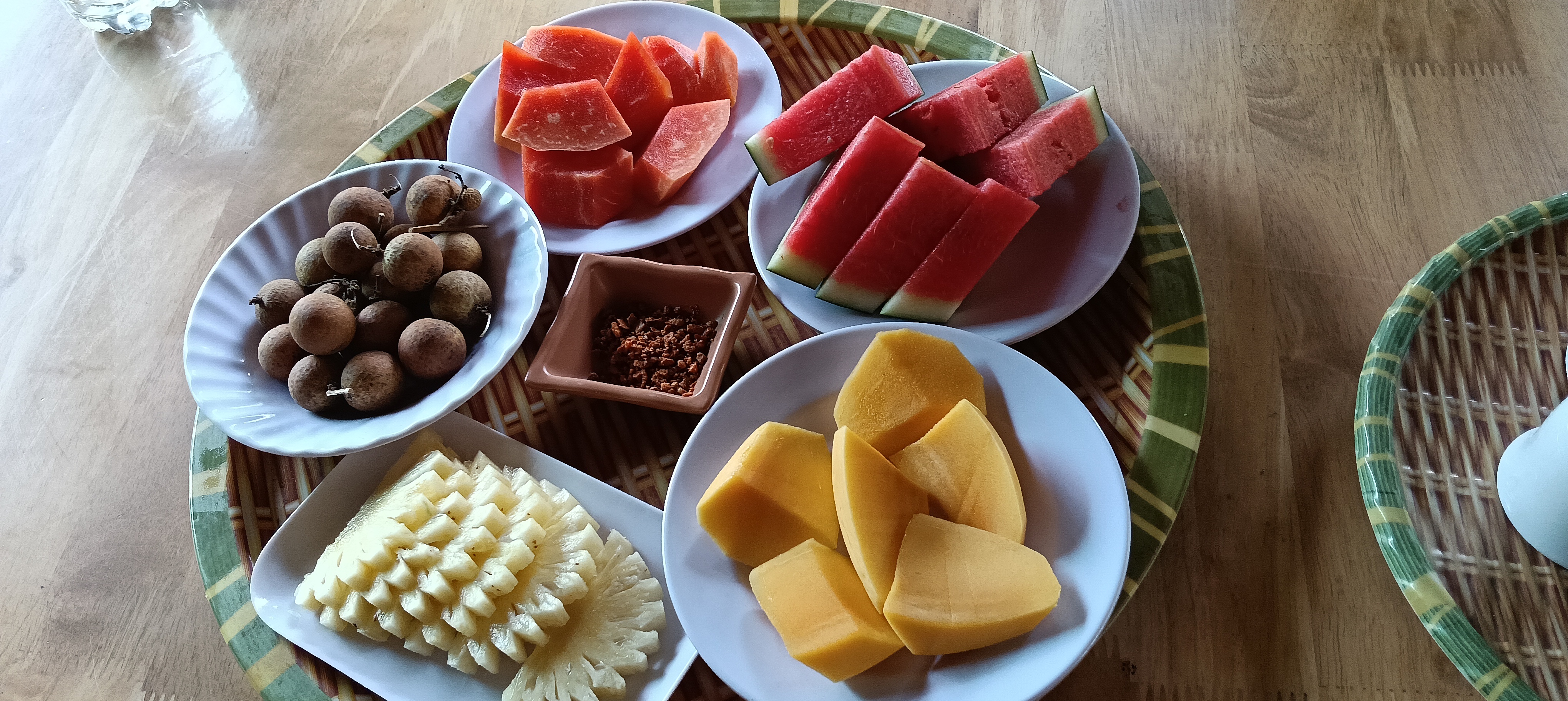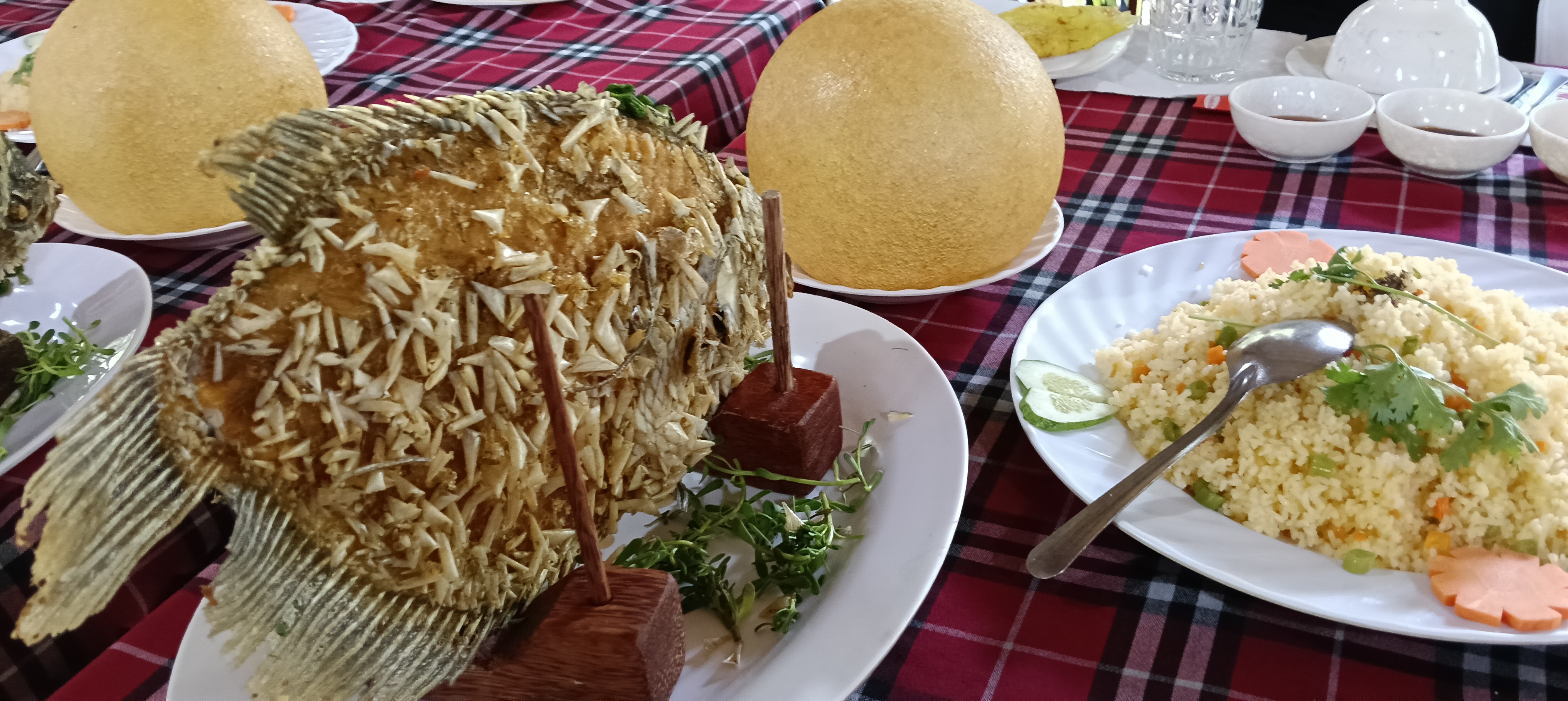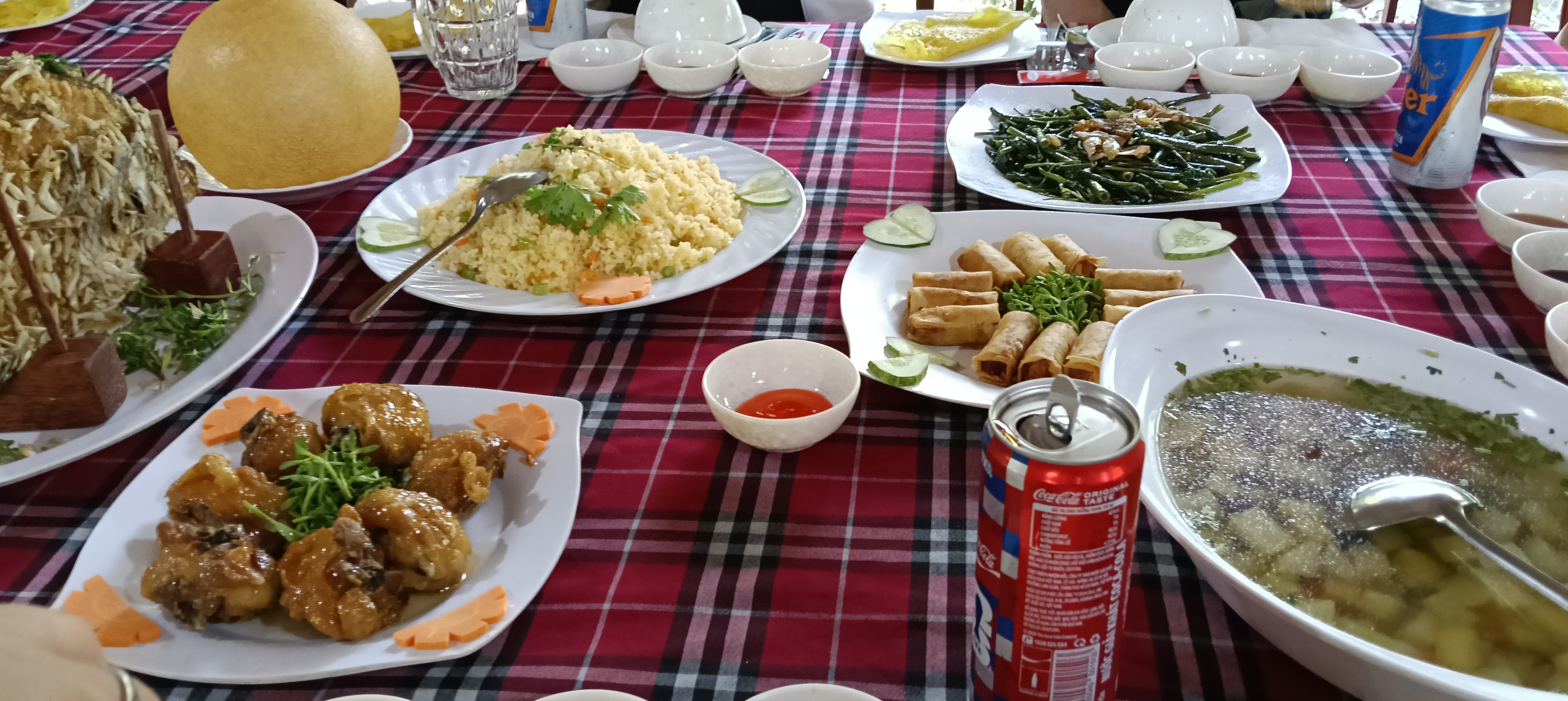 お昼ご飯は揚げ春巻きと風船せんべいは美味しかった。鳥と魚は…