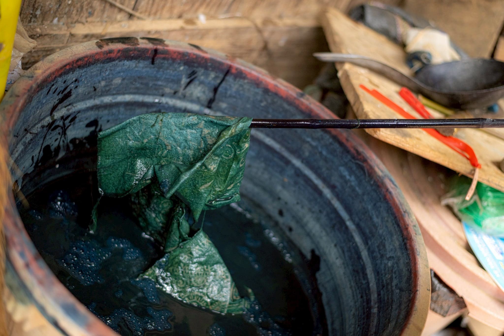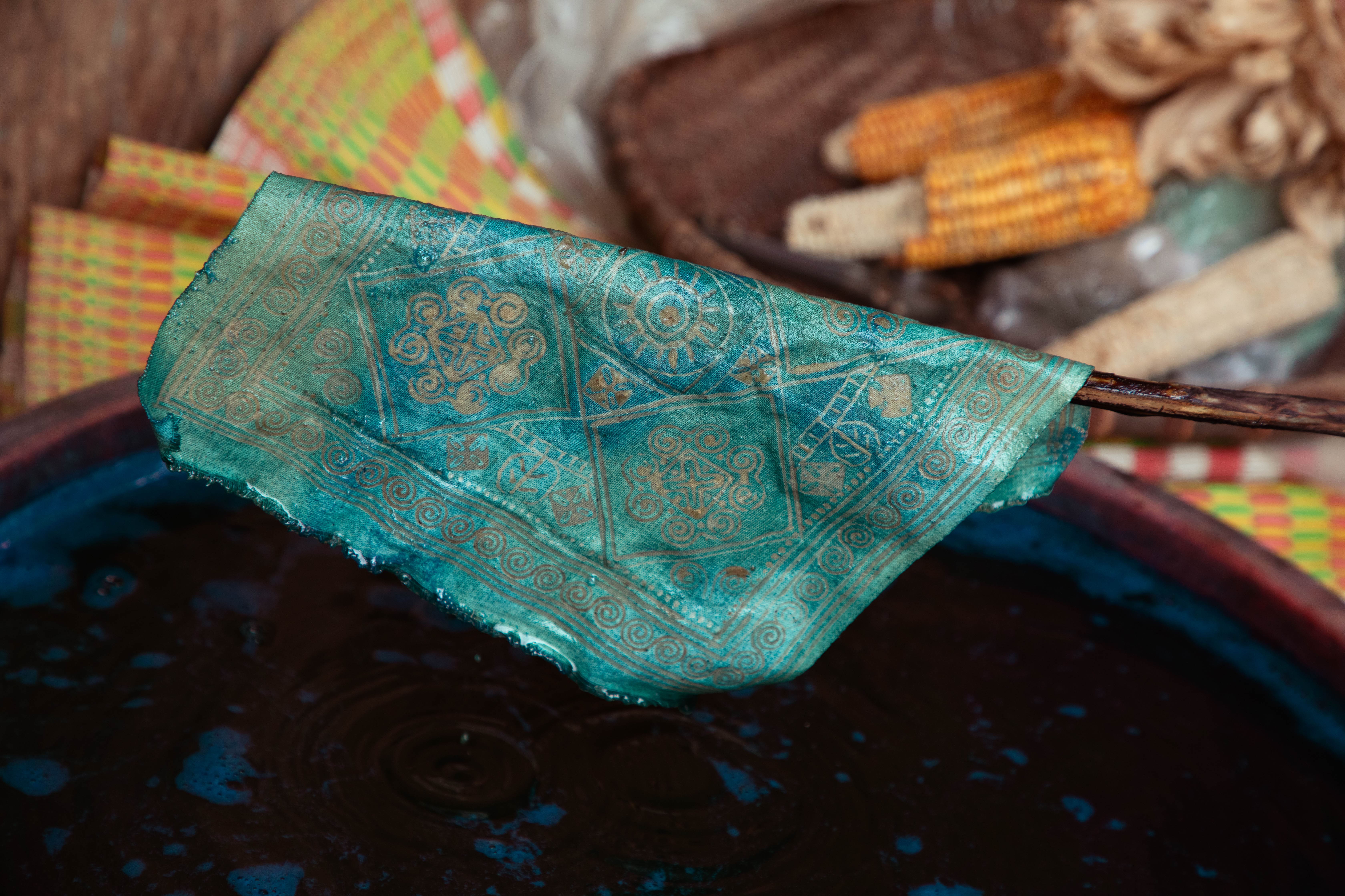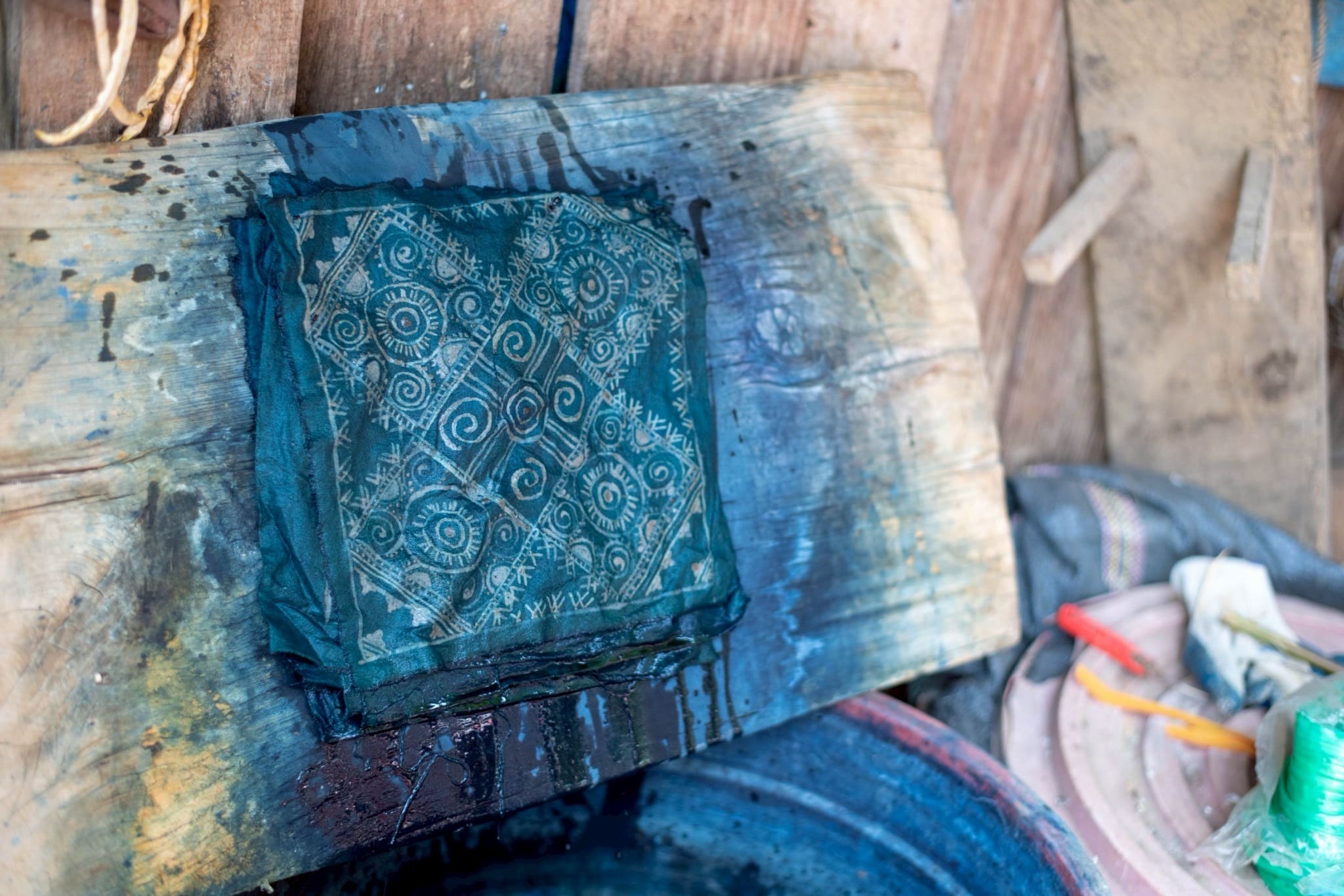 ここでは、モン族に受け継がれてきた伝統文化のひとつ、「ろうけつ染め(藍染め)」を体験することができます。