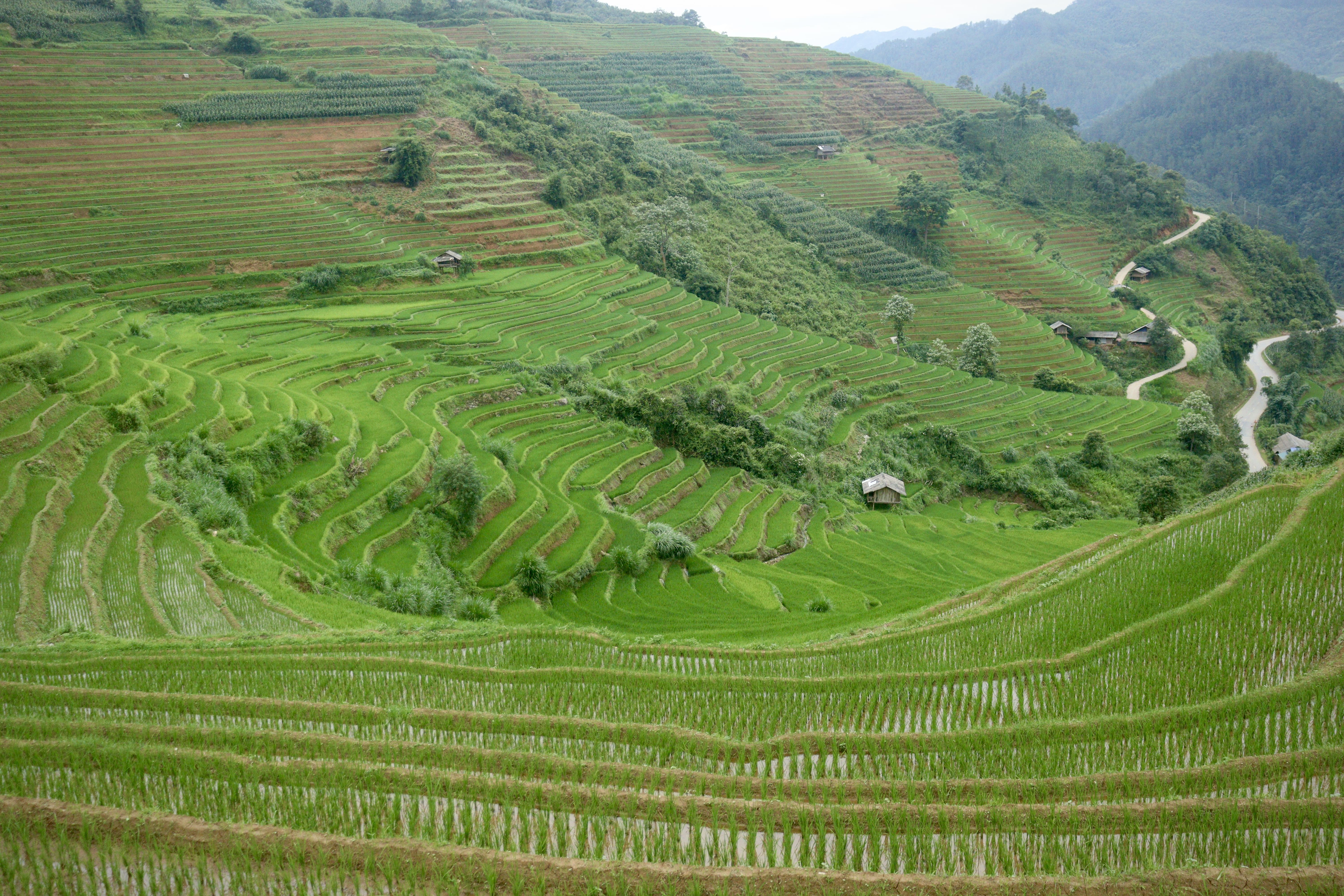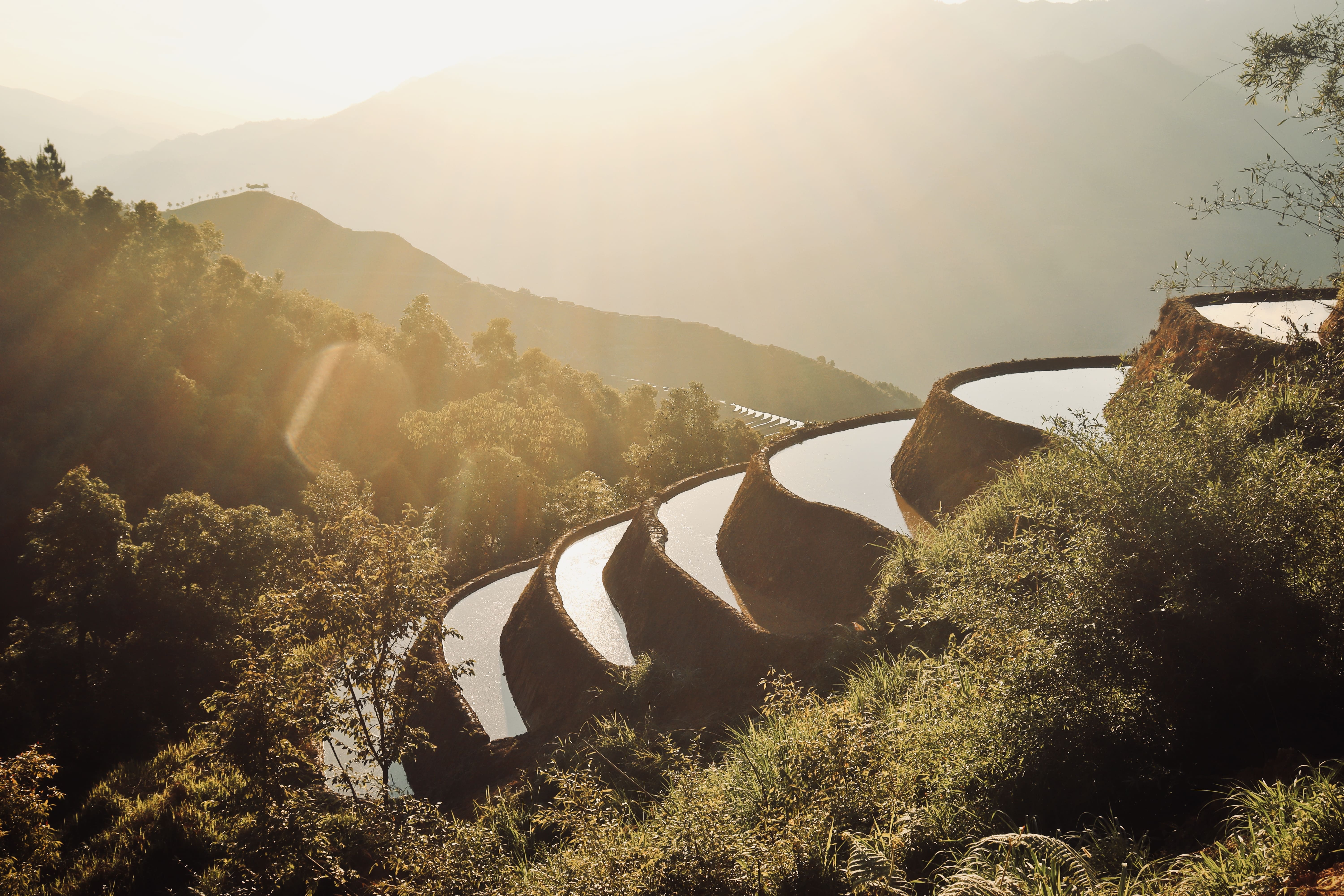トレッキング中や移動の車窓から眺める、幾重にも連なる壮大な棚田の景色は、この旅を象徴する圧巻の光景です。