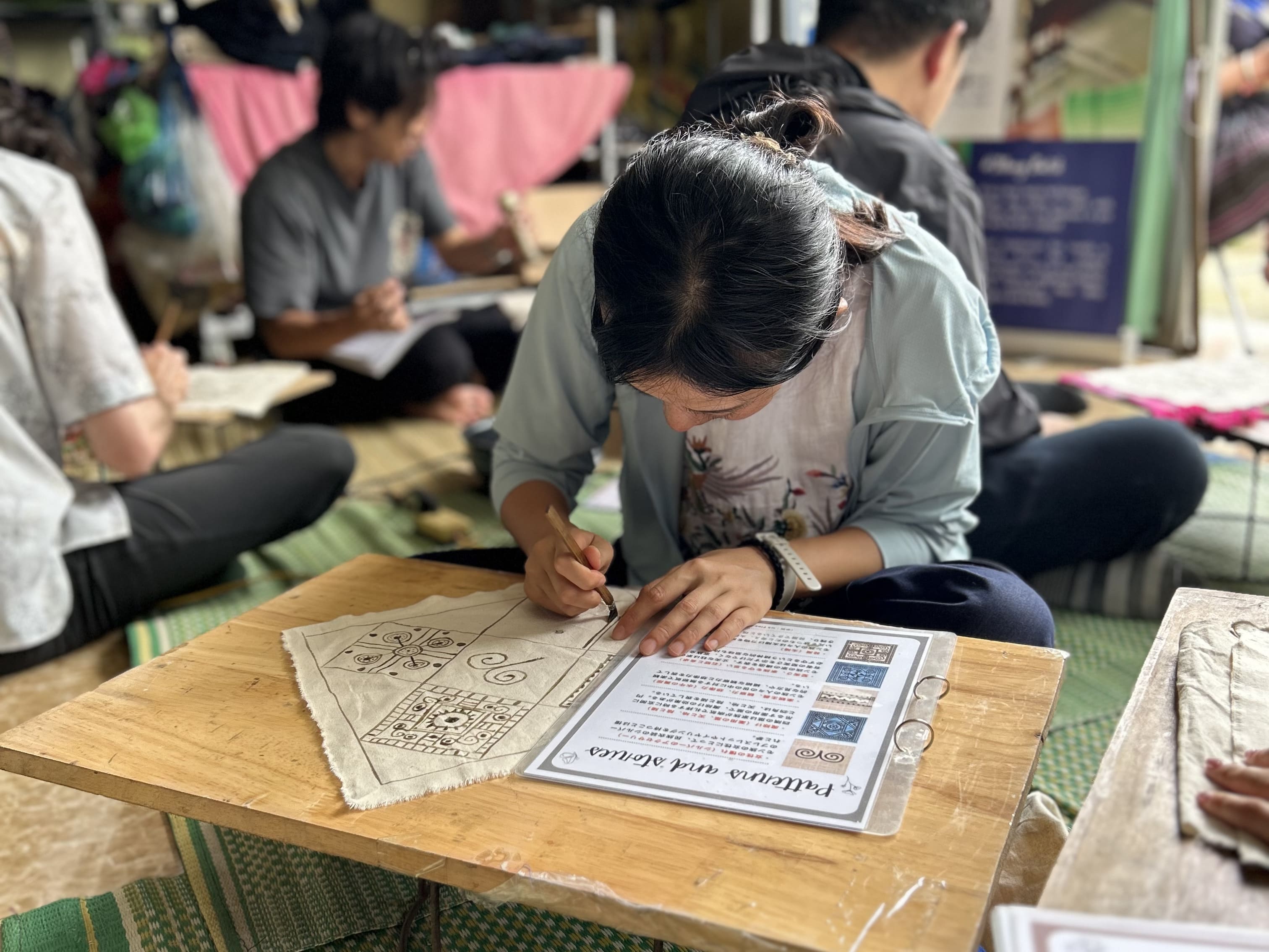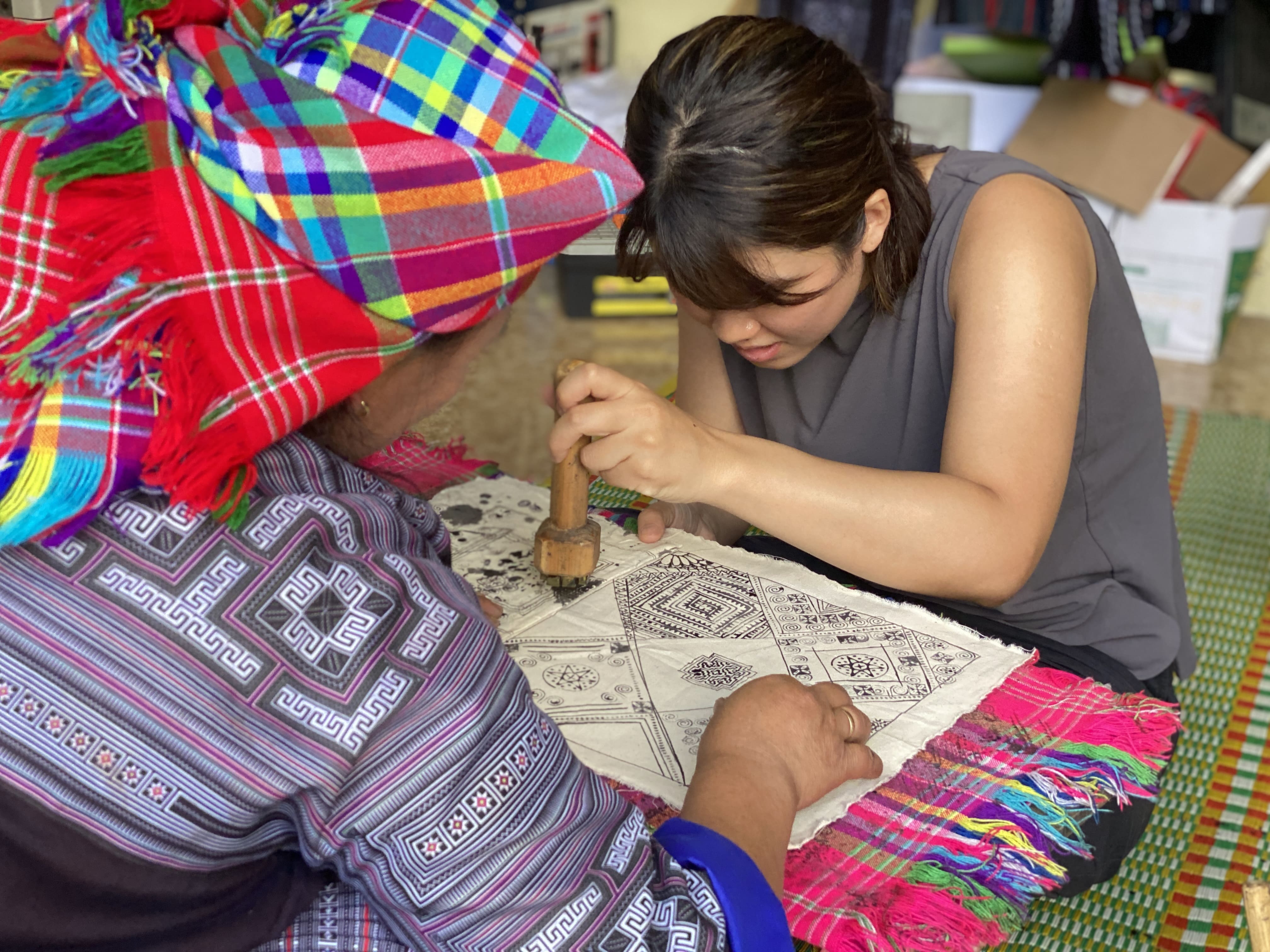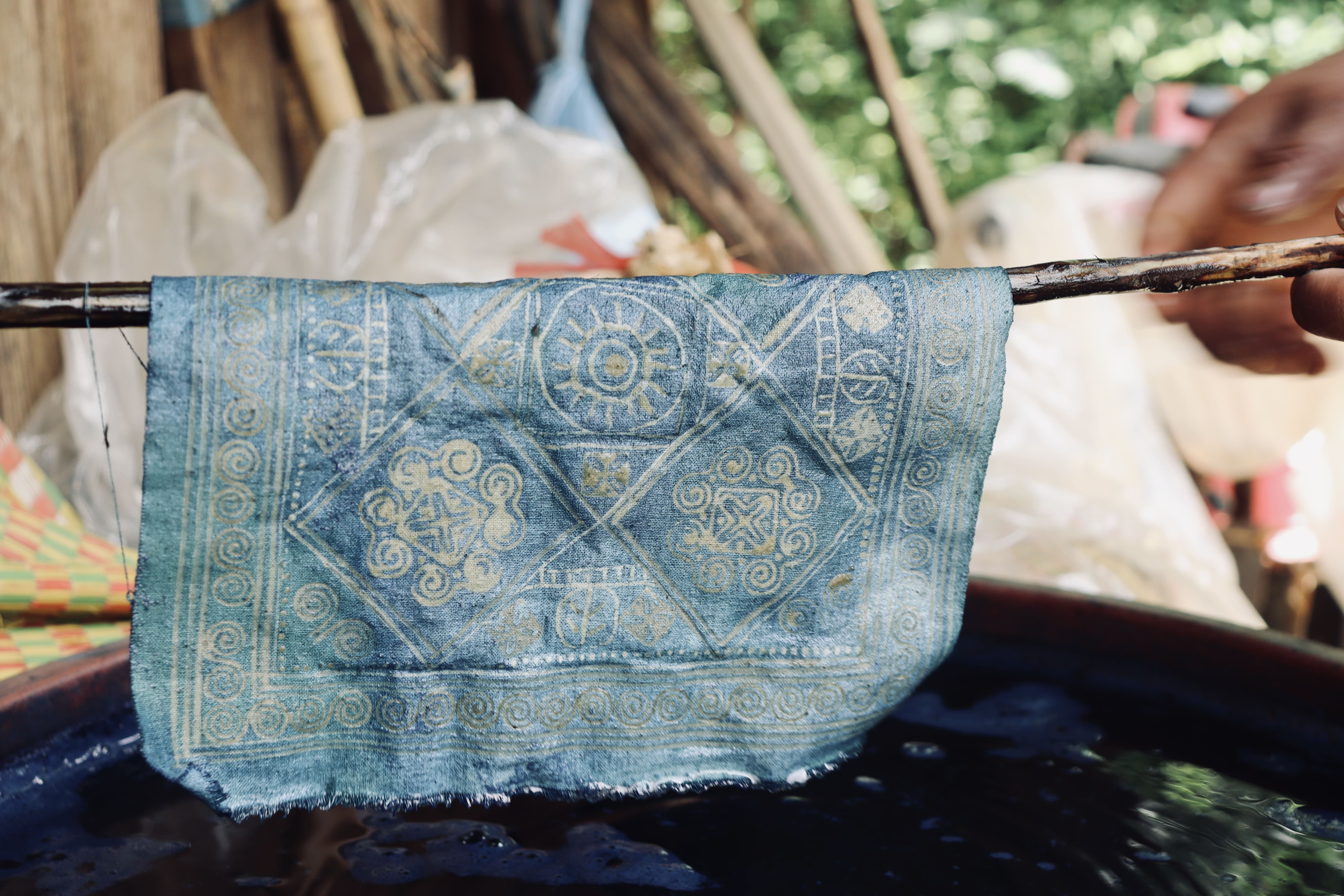 宿をチェックアウト後、モン族のろうけつ染め(染め物)を体験いただけます。 ご自身でオリジナルに布をデザインしていただき、布を藍染めする工程を見学できます。 染め物体験後は、機織り体験や民族衣装体験、モン族の織物を使ったお土産商品の購入もできます。 |