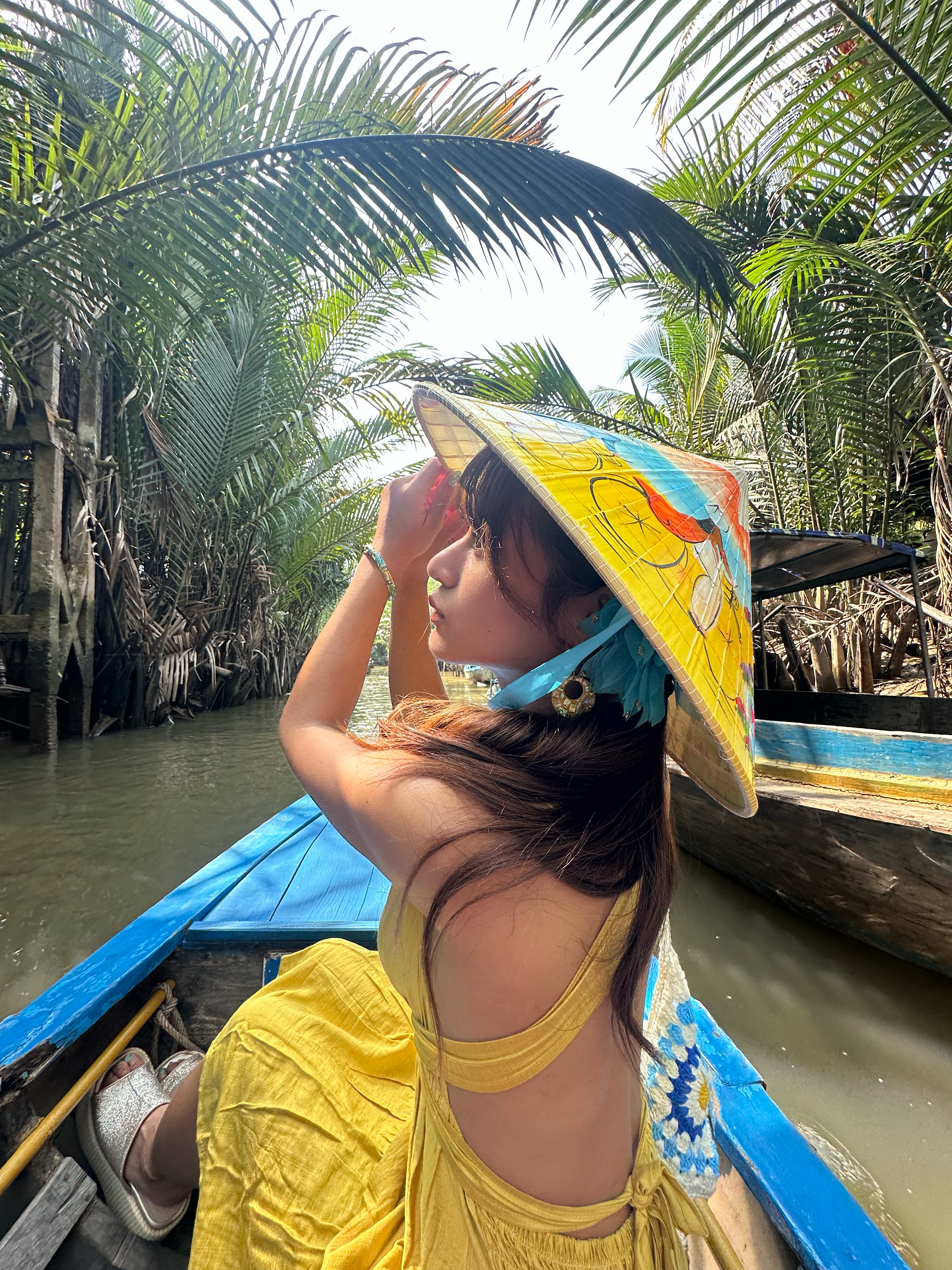 念願の手漕ぎボートでのジャングルクルーズは期待をはるかに上回る満足感を得られました!ノンラーというベトナムの有名な帽子をかぶって気分も最高潮!