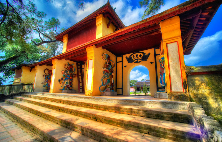 トゥニャン塔を通り過ぎて中国風の装飾を施された門をくぐると、いよいよ目に入るのはお寺の本堂である大雄殿です。本堂の前には、身体を清めるために日本風の常香炉が設置されています。本堂内部には、三尊仏が安置されています。この三尊仏は、初代阮王朝皇帝ザーロン帝を助け、当時争っていたタイソン朝を破ったポルトガル人のジーン・デ・ラクロイスによって鋳造されたと言われています。当時ベトナムでは漢字が公用文字でとして用いられていたので、本堂の至る所にある「漢字」が建築様式や装飾と相まって、より中国風なお寺であることを増長させます。