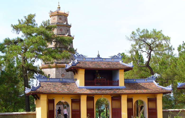 フエの市街地から5kmほど離れたフォン川を一望できる丘の上にある「ティエンムー寺」は、1601年に建立されたフエで最も古い寺院の一つです。漢字で書くと「天姥寺」となり、阮王朝時代よりさらに前の広南国時代に、ある一人の老婆が「いずれ支配者がここに現れ、塔を建てることだろう」と予言したことに起因しています。建物以外にも宗教弾圧対して自分の身を犠牲にして抗議した僧侶に関する展示品もあり、宗教について色々考えさせられる観光スポットになっています。