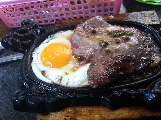 半熟卵のステーキソースにフランスパンをつけて食べるのが
