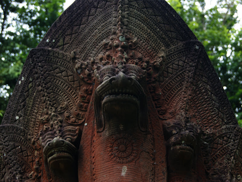 東門テラスの欄干部分に立つ5つ頭の蛇神ナーガは、これほど崩壊した遺跡の中にありながら、驚くほどよく原型をとどめており、アンコール遺跡群の中でも最も美しいナーガだと言われています。