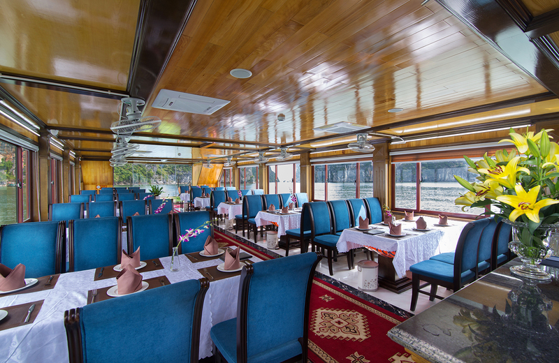 | 12:00頃 | ハロン湾到着。日帰りボートに乗り移り、クルージング開始 乗船後すぐにご昼食となります。 昼食後、2階デッキ等にのぼりハロン湾の景色をお楽しみいただけます |