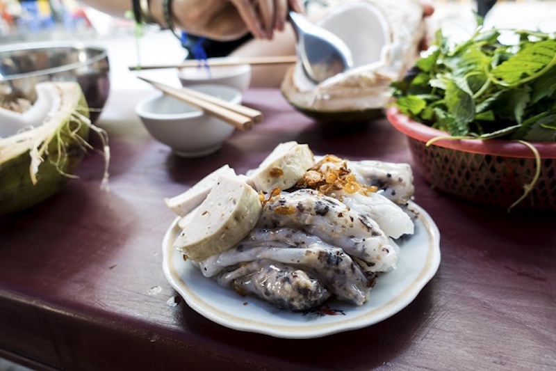 甘辛く味付けしたエビをタピオカ粉の生地で包み、さらにバナナの葉で包んで蒸した、フエの伝統料理です。半透明に透けた生地が美しく、ヌクマムにつけて食べてみると、もちもちプルプルの食感がやみつきになる美味しさです。元々はフエの宮廷料理でしたが、今ではおやつとして気軽に食べられています。