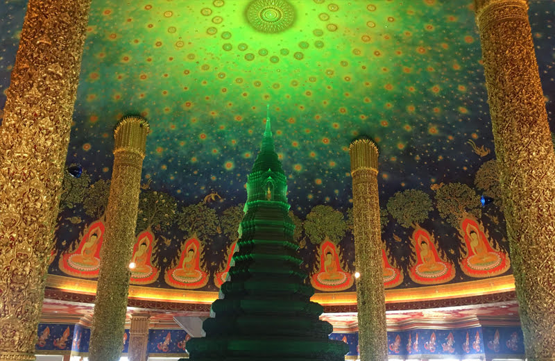 日本人観光客が数多く足を運ぶインスタ映えスポット「ワット パクナム」。その見所はなんといっても緑色に輝く仏塔と幻想的な天井画。