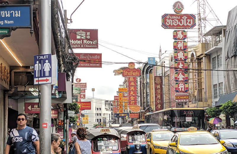 こちらのお店はMRT「ワット・マンコーン駅」を出て、車が一台通れるほどの路地をチャイナタウンのメインストリートであるヤワラート通りに向かって歩きます。ヤワラート通りに出たら左に曲がって進むとすぐにホテルロイヤルバンコクに到着します。