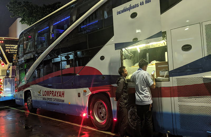 バスは昼行便と夜行便の2便が出ています。私が利用したのは夜行便です。夜行便は21時にカオサン通りをバスが出発して、途中で船に乗り換え、9時前ごろにタオ島に到着します。