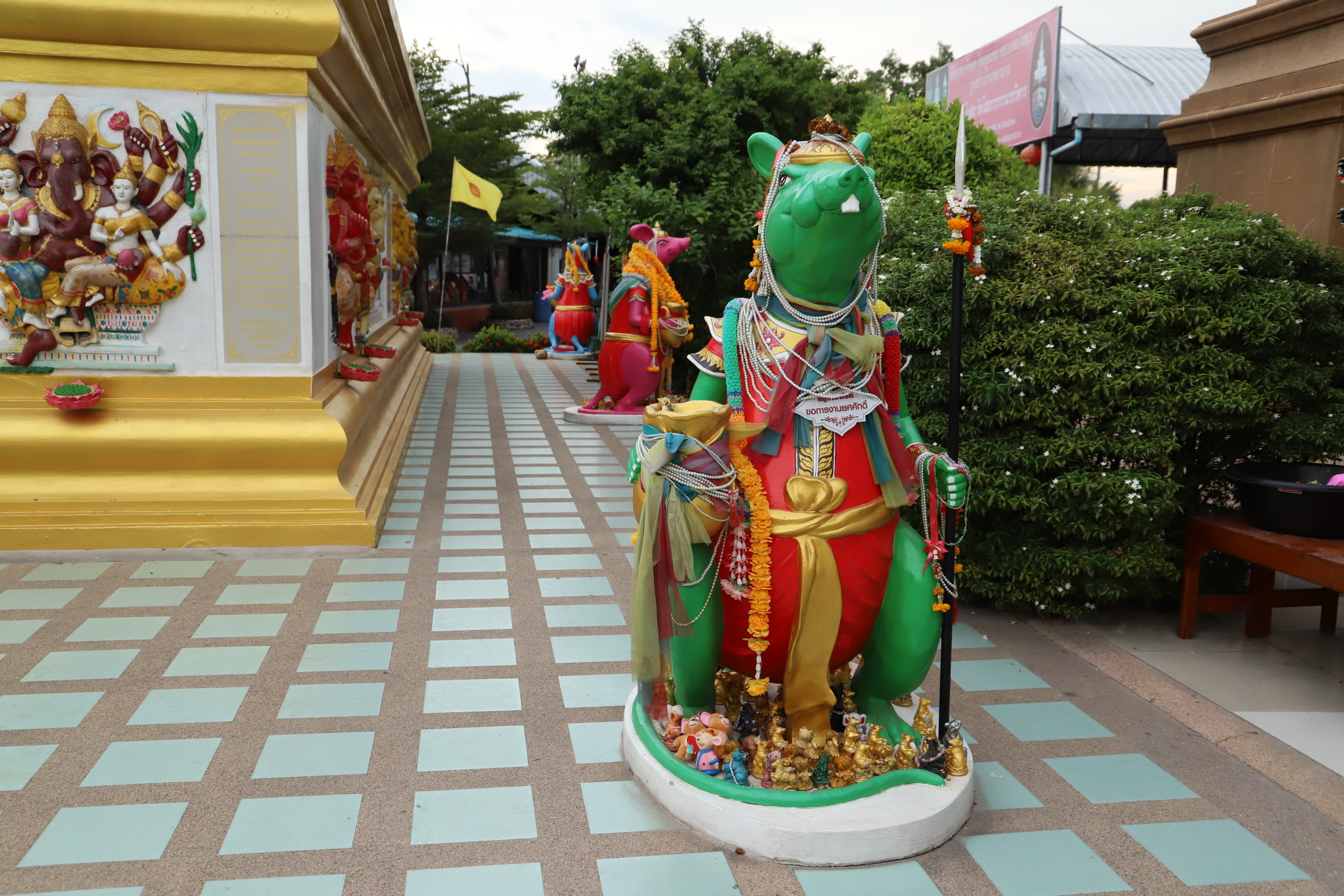 そのピンクガネーシャの周りには、色とりどりのネズミが点在。タイでは曜日ごとに色が決まっており、自分の生まれた曜日の色のネズミに、内緒話のように願い事を話しかけると、夢が叶うといわれています。