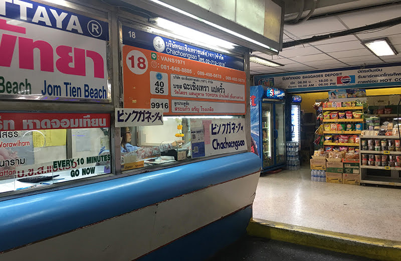 中に入ると窓口ごとに番号が割り振られており、その中の「18番窓口」で、ピンクガネーシャがある県「チャチュンサオ」のバスターミナル行きのチケットが購入できます。窓口に大きく「ピンクガネーシャ」と書かれてあるのでわかりやすいでしょう。値段は99バーツ(約380円)