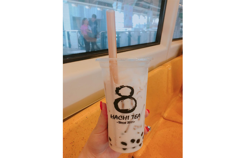 HACHIも同じく、駅構内でちょくちょく見かけるタピオカドリンクのお店です。なぜか日本語の店名がついているこのお店は「HACHI(8)」にちなんで8回通うと一杯タダになるスタンプカードがもらえます。40バーツ(約130円)と、Ochayaほどではありませんがとっても安価。