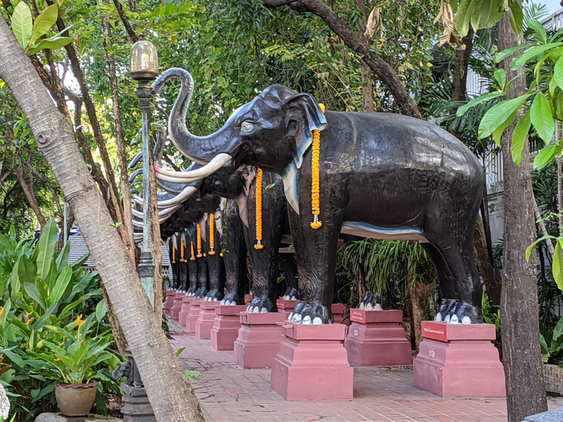 メインのドームを見学し終わったら、周りの庭園も忘れずに見学してくださいね。こちらにもゾウが並んでおり、そちらに目が行ってしまうガチなのですが、よく見ると庭園にはタイの神様のゾウがあちらこちらに…。それぞれの神様の名前もきちんと紹介されていました。
