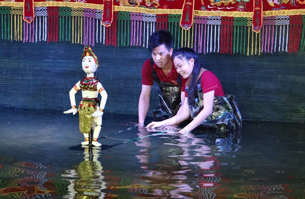 水上人形劇を鑑賞します。ベトナム発症の水上人形劇は、ベトナムでは非常にポピュラーな夜のアクティビティです。 |