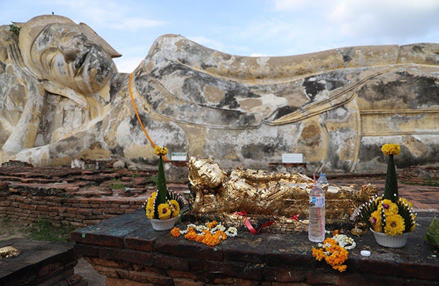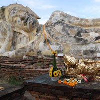 アユタヤ内最大の全長28メールに及ぶ涅槃像です。アユタヤの中心遺跡群から離れており、周りには寺院や遺跡はほとんどなく、広々とした空間が広がっています。アユタヤ王朝を見つめてきた穏やかな表情は、心がやすらぎます。
