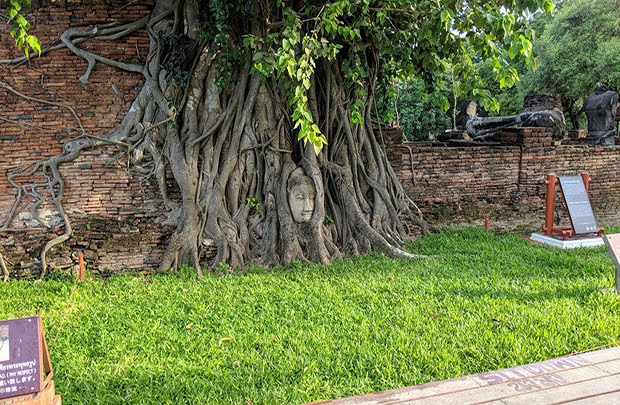 アユタヤを代表する樹木で包まれた仏頭で有名な寺院です。アユタヤはかつて反映を極めた巨大都市でしたが、18世紀のビルマ軍の侵攻で破壊されつくされました。破壊されてもなお、存在感のある巨大な仏舎利塔や石像の数々は神秘的な雰囲気をまとっています。