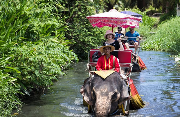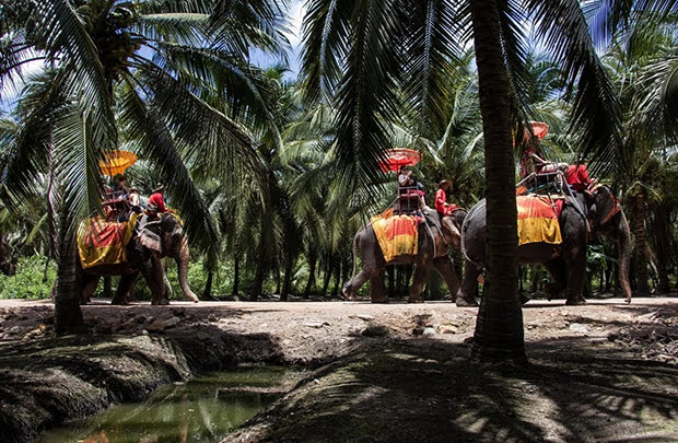 当ツアーの象乗り体験は本格的なコースとなっています。約25分、南国の植物に囲まれた園内をお散歩致します。途中、ヤシ畑の散策や水路へジャブジャブはいる場面も!エキサイティングでちょっぴりスリリングな象乗りをお楽しみください。
