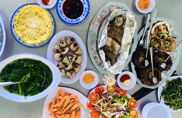 ダイビングの後は、ベトナム料理のランチつき!養殖されている、新鮮な魚介類をその場で注文して、お召し上がりできます。港町ニャチャンの魚介類は絶品です!